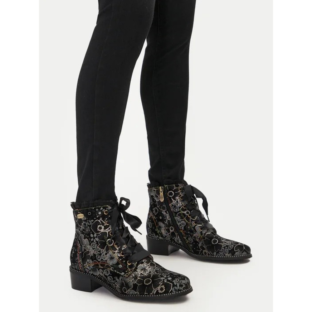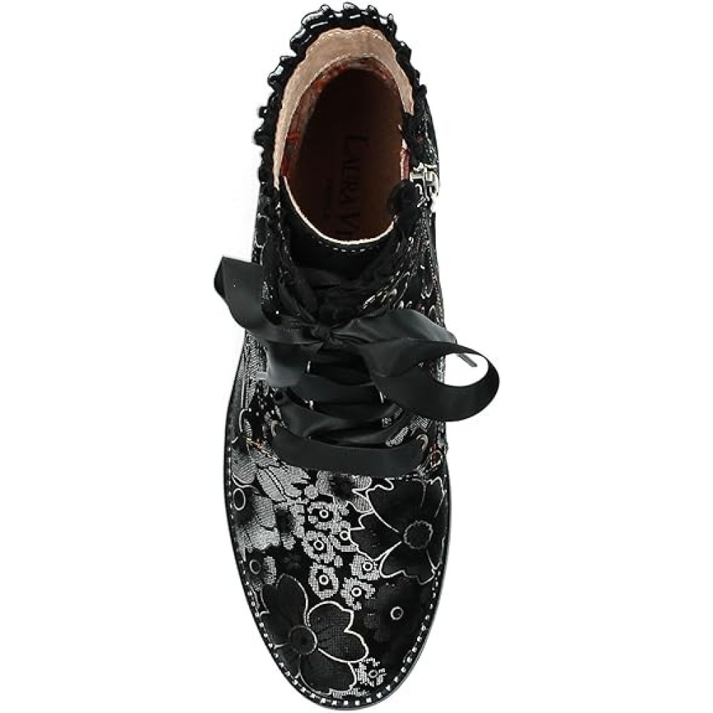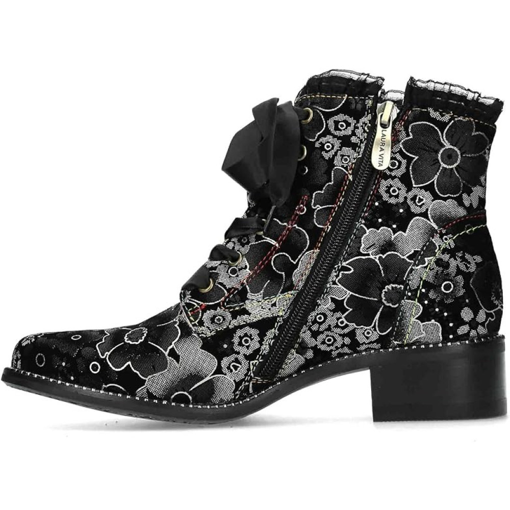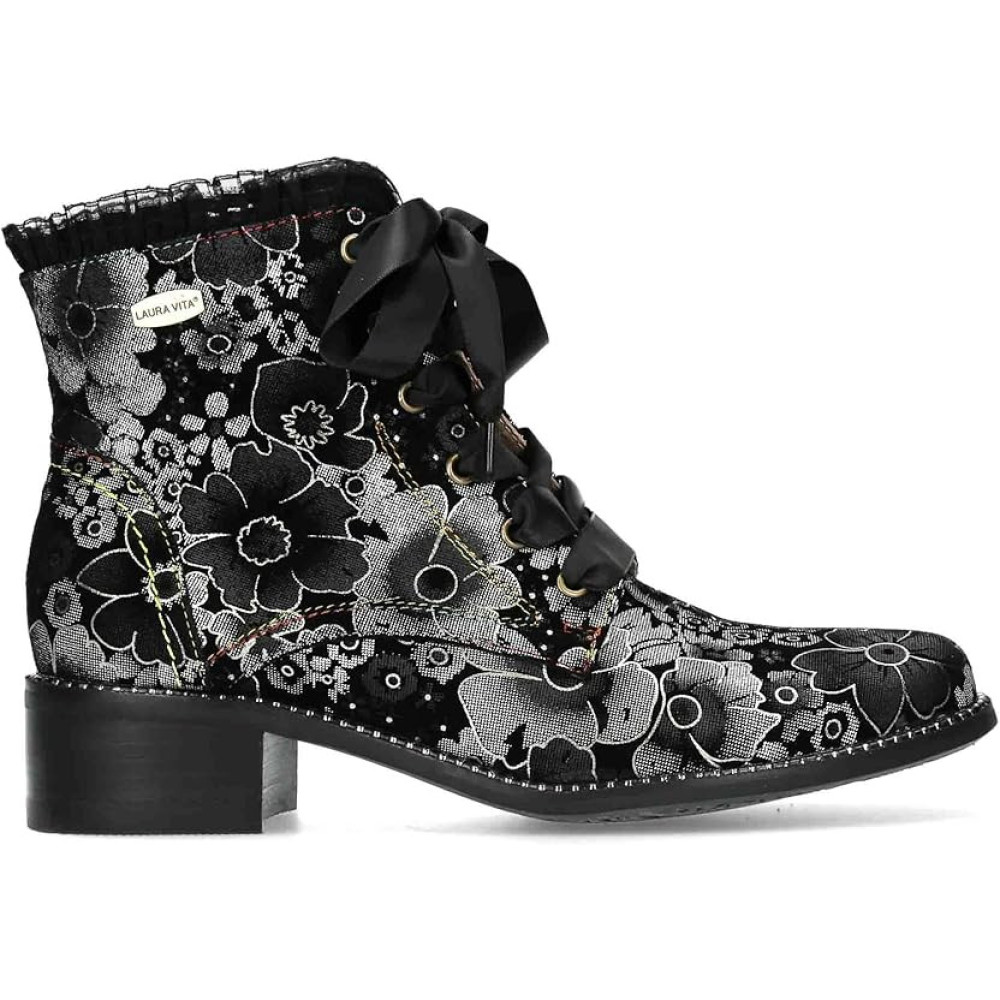 El artículo EMCMAO 45 de Laura Vita es un modelo de botines para mujer, no sandalias, que se caracteriza por su diseño militar con un estampado floral y detalles metalizados en la versión "Acier" (acero/plata).