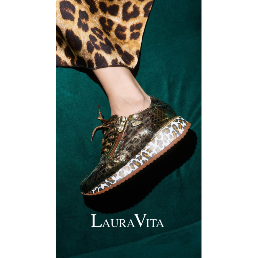 La Laura Vita DELPHINE 46 Oro es una zapatilla deportiva para mujer conocida por su estilo atrevido y sofisticado, que combina piel y lentejuelas en tonos dorados y marrones.