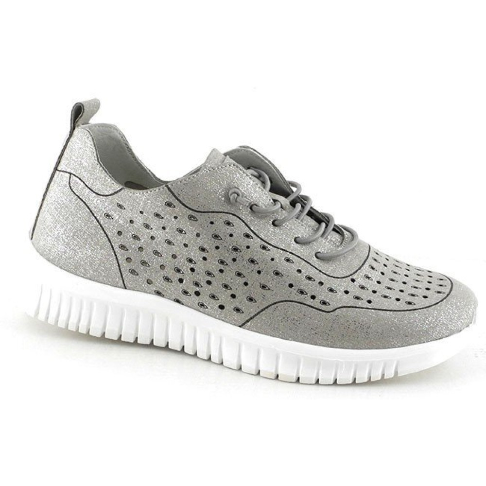 Zapatillas estilo deportivo casual para mujer en un acabado plateado o platino con brillo, fabricadas en material sintético o piel vegana. El diseño presenta un distintivo troquelado perforado que cubre gran parte del empeine, ideal para una óptima transpirabilidad y frescura, perfecto para primavera y verano.