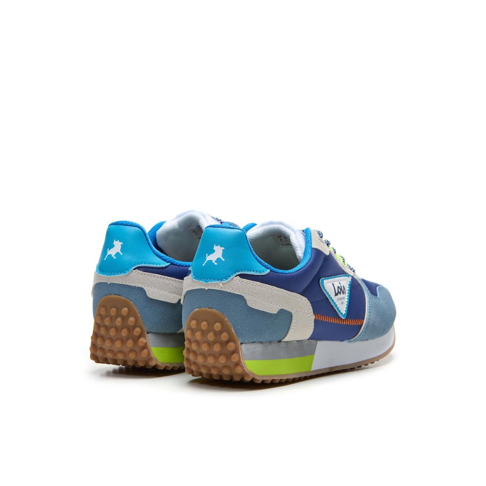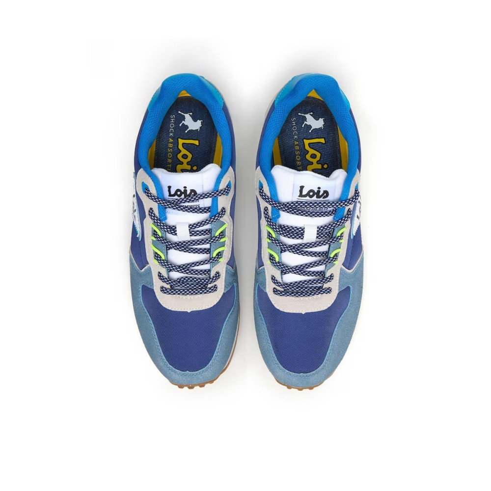 Esta zapatilla deportiva desprende frescura y buen rollo desde el primer vistazo. Su combinación de tonos azules —desde el azul intenso hasta el celeste suave— crea un efecto dinámico y muy actual. Los detalles en verde en la suela aportan un contraste divertido y lleno de energía, mientras que el logo “Lois” en el lateral destaca con personalidad.