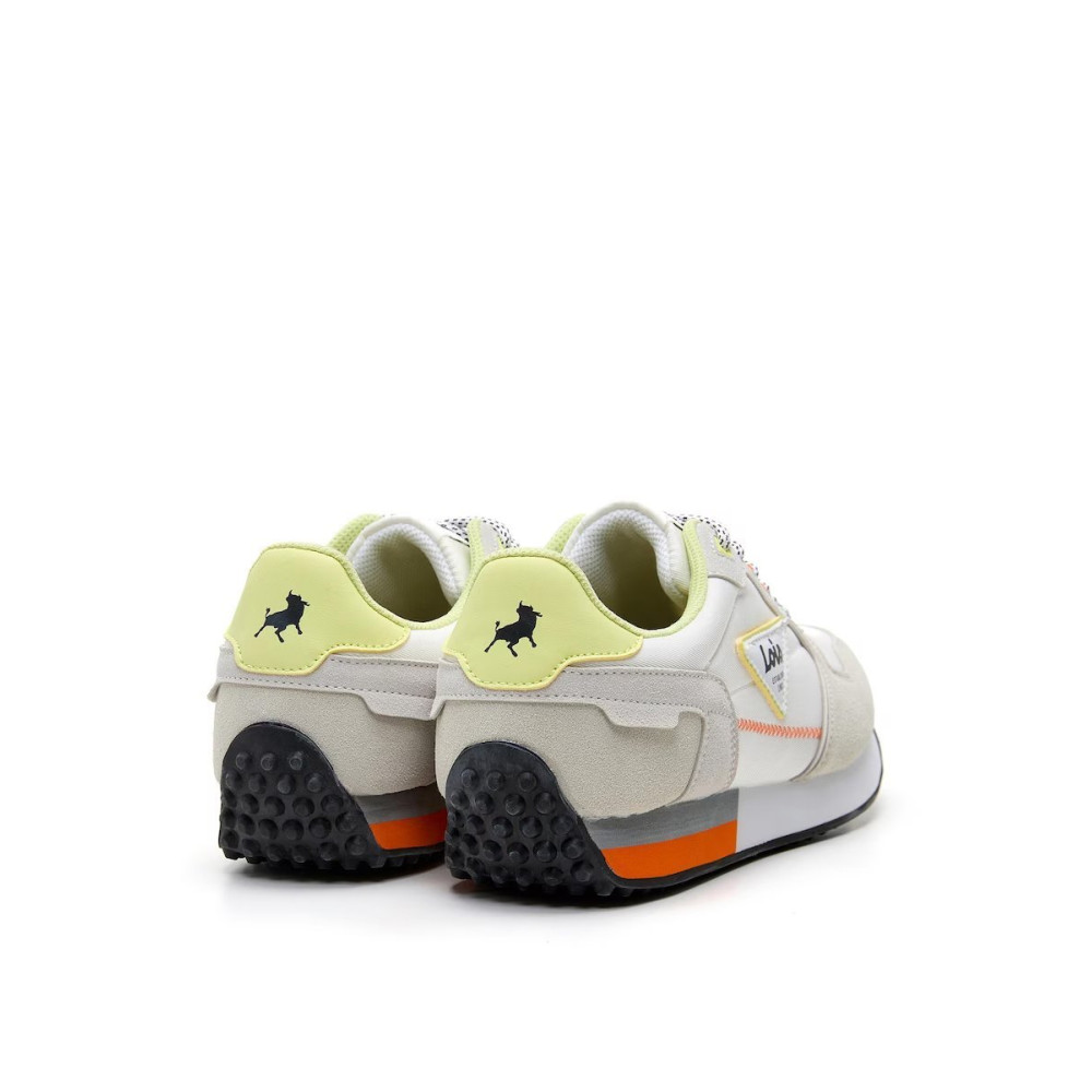 Esta zapatilla deportiva combina estilo y frescura con un toque alegre que la hace destacar al instante. Su base en tonos neutros como blanco y gris se llena de vida con detalles en amarillo suave y vibrantes acentos en naranja, creando un contraste moderno y lleno de energía.