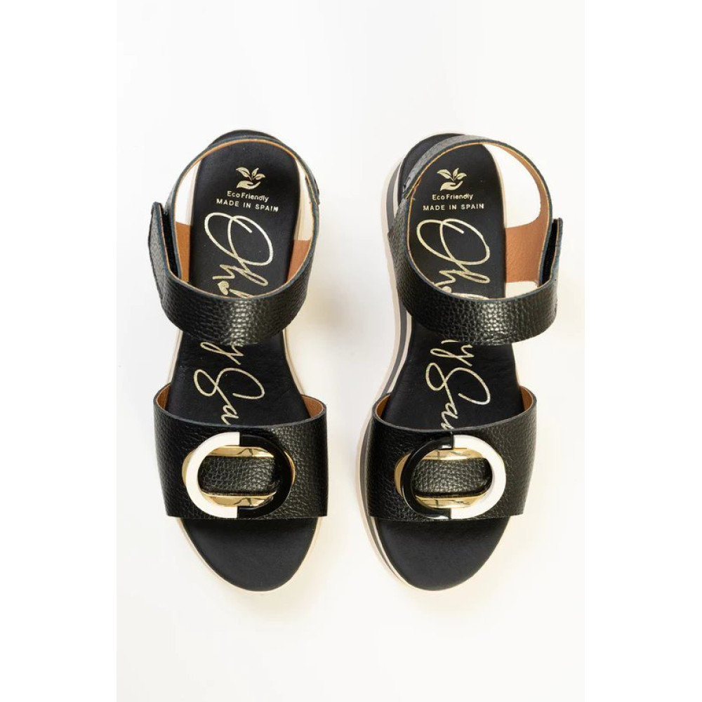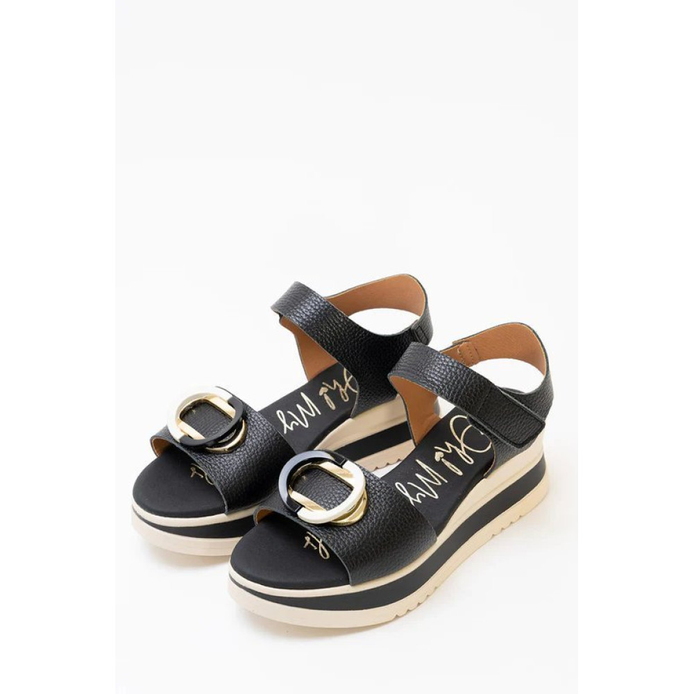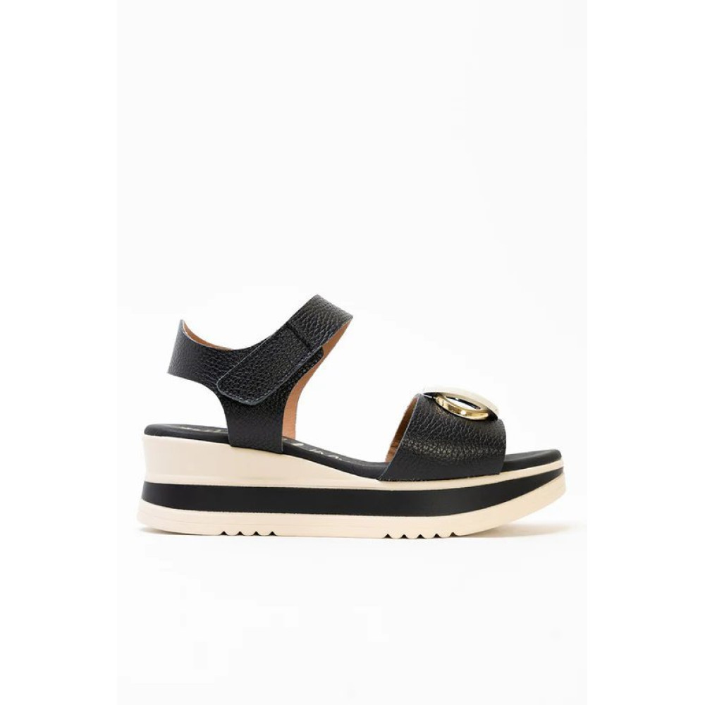 Sandalia de mujer fabricada en piel de color negro con suave grabado. El modelo Tiara destaca por su cierre ajustable de velcro y su adorno en la pala, haciéndolo más moderno y sofisticado. Gracias a su cuña y su planta de microfibra transpirable confort gel, podrás llevarlas puestas todo el día sin problema de dolor de pies.